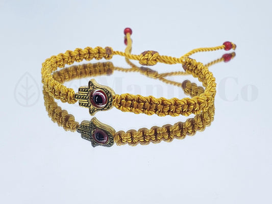 Hamsa Hand bracelet with an evil eye for protection and good luck, braided gold string wristband with a gold color hamsa hand, adjustable