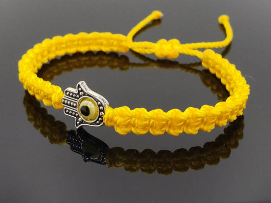 Hamsa Hand yellow bracelet with an evil eye for protection and good luck braided yellow string wristband with a silver color hamsa hand