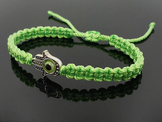 Hamsa Hand lime green bracelet with an evil eye for protection & good luck braided green string wristband with a silver color hamsa hand
