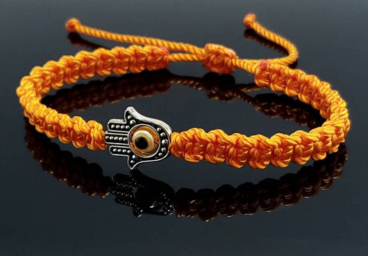 Hamsa Hand orange bracelet with an evil eye for protection and good luck, braided orange string wristband with a silver color hamsa hand