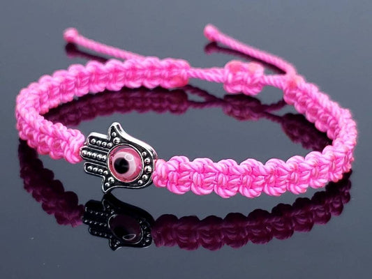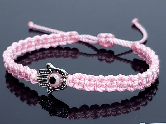 Hamsa Hand baby pink bracelet with an evil eye for protection & good luck braided pink string wristband with a silver color hamsa hand