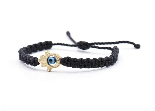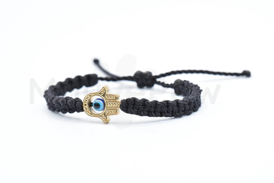 Hamsa hand bracelet with an evil eye for protection & good luck, braided black string wristband with a gold color hamsa hand adjustable