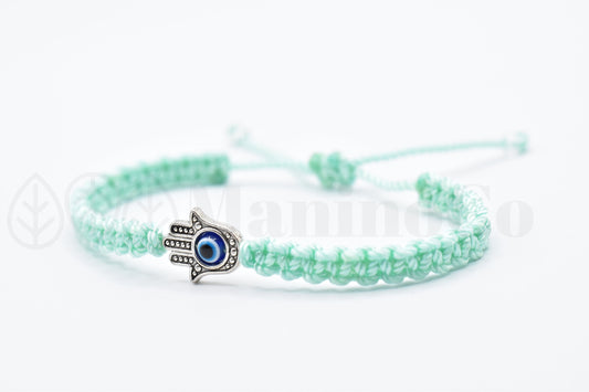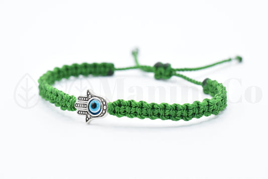 Hamsa Hand money bracelet with an evil eye for protection & good luck braided green string money wristband with a silver color hamsa hand