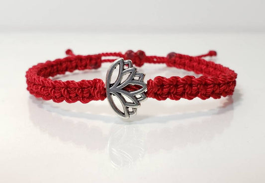 Lotus flower bracelet, red string braided bracelet, silver tone lotus flower charm, new, adjustable for man & woman