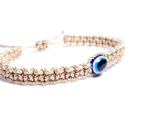 evil eye braided bracelet, beige string wristband with an evil eye for protection, adjustable for man and woman