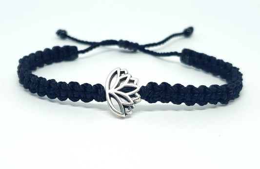 Lotus flower bracelet, black string braided bracelet, silver color lotus flower charm, new, adjustable for man & woman