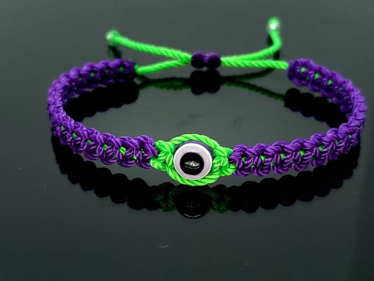 evil eye protection bracelet, purple & neon green braided wristband, adjustable protection bracelet for man and woman