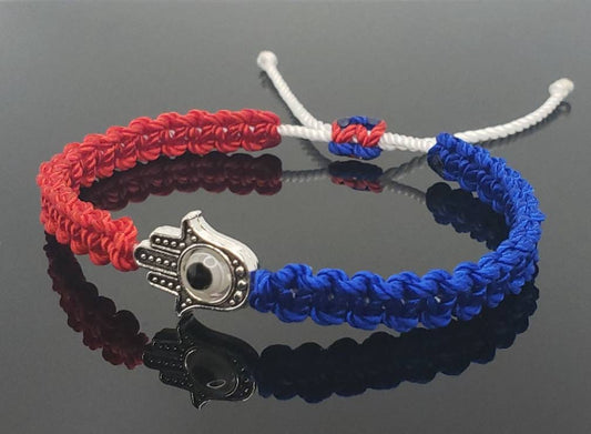 Hamsa hand blue red & white string bracelet for happiness luck health and good fortune. good luck wristband evil eye charm, USA patriotic