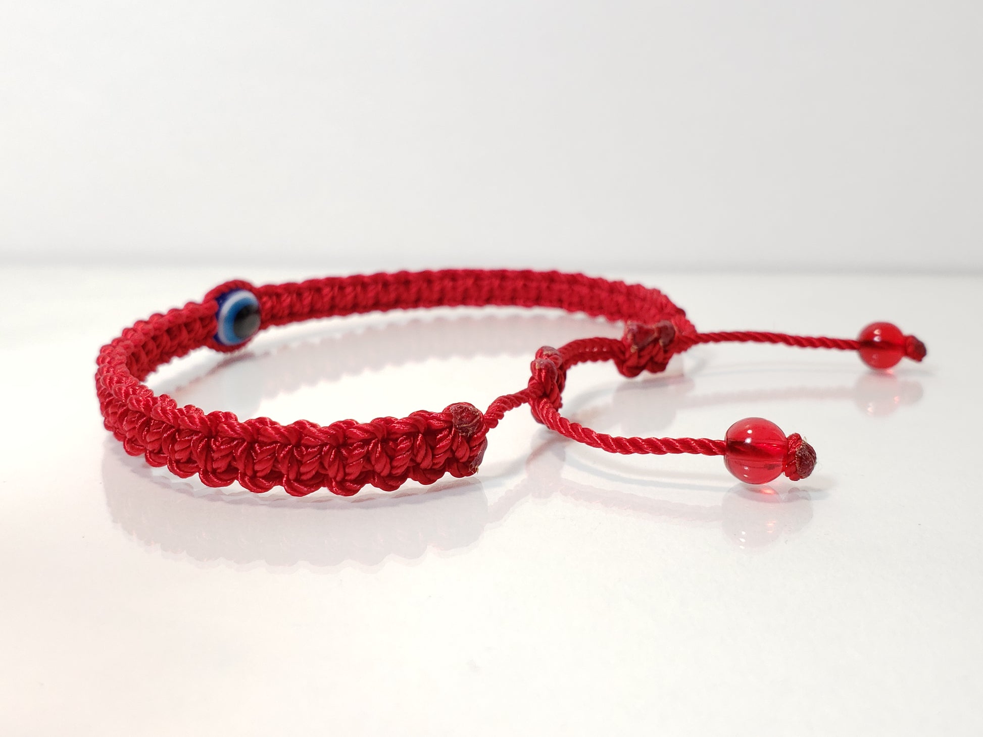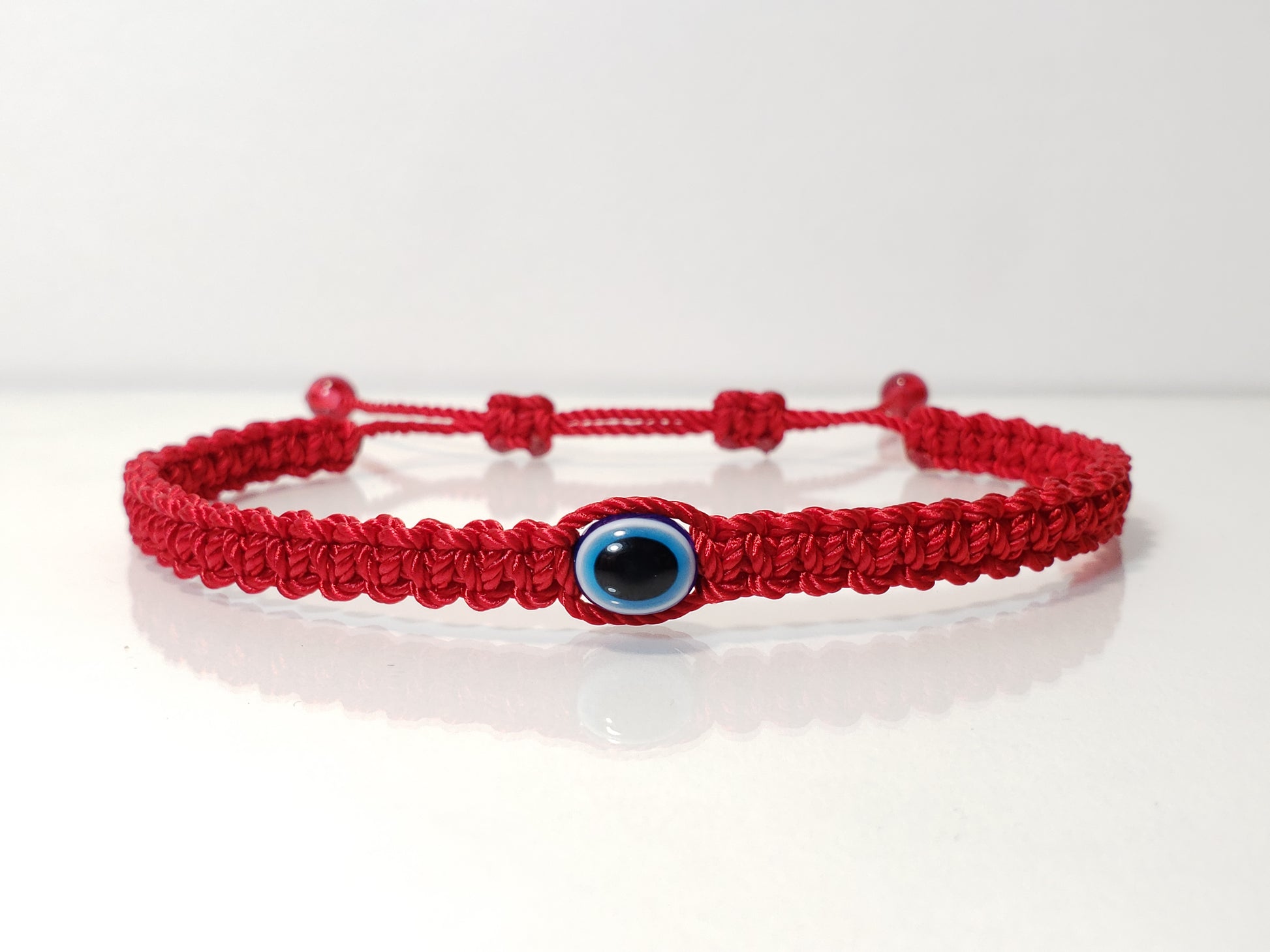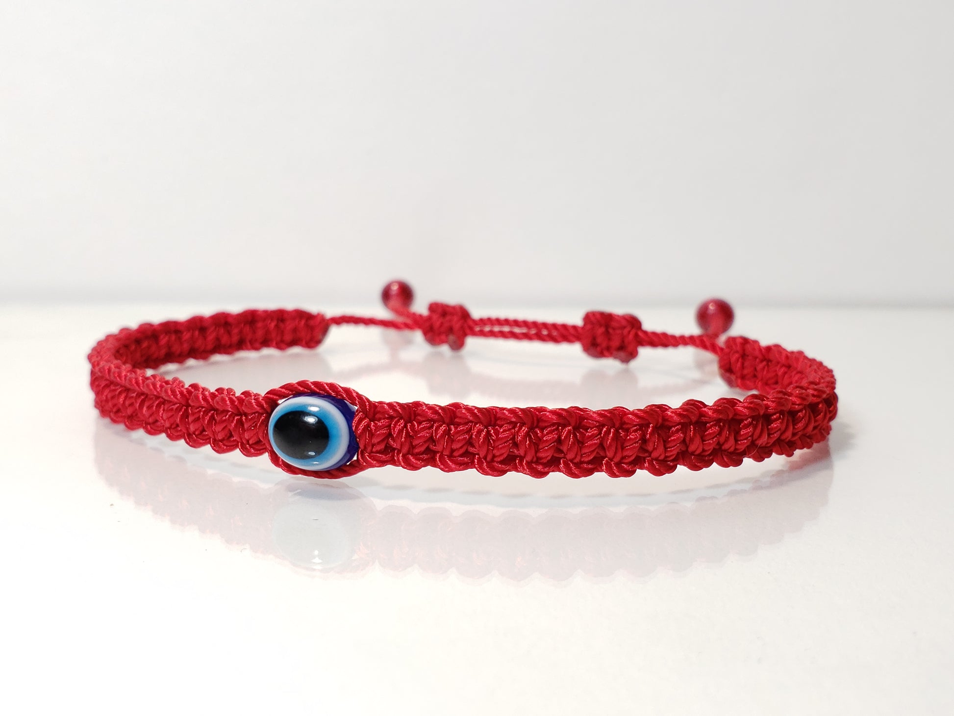 hand-made red string evil eye anklet with an evil eye, adjustable from 7 to 12 1/2 inches.