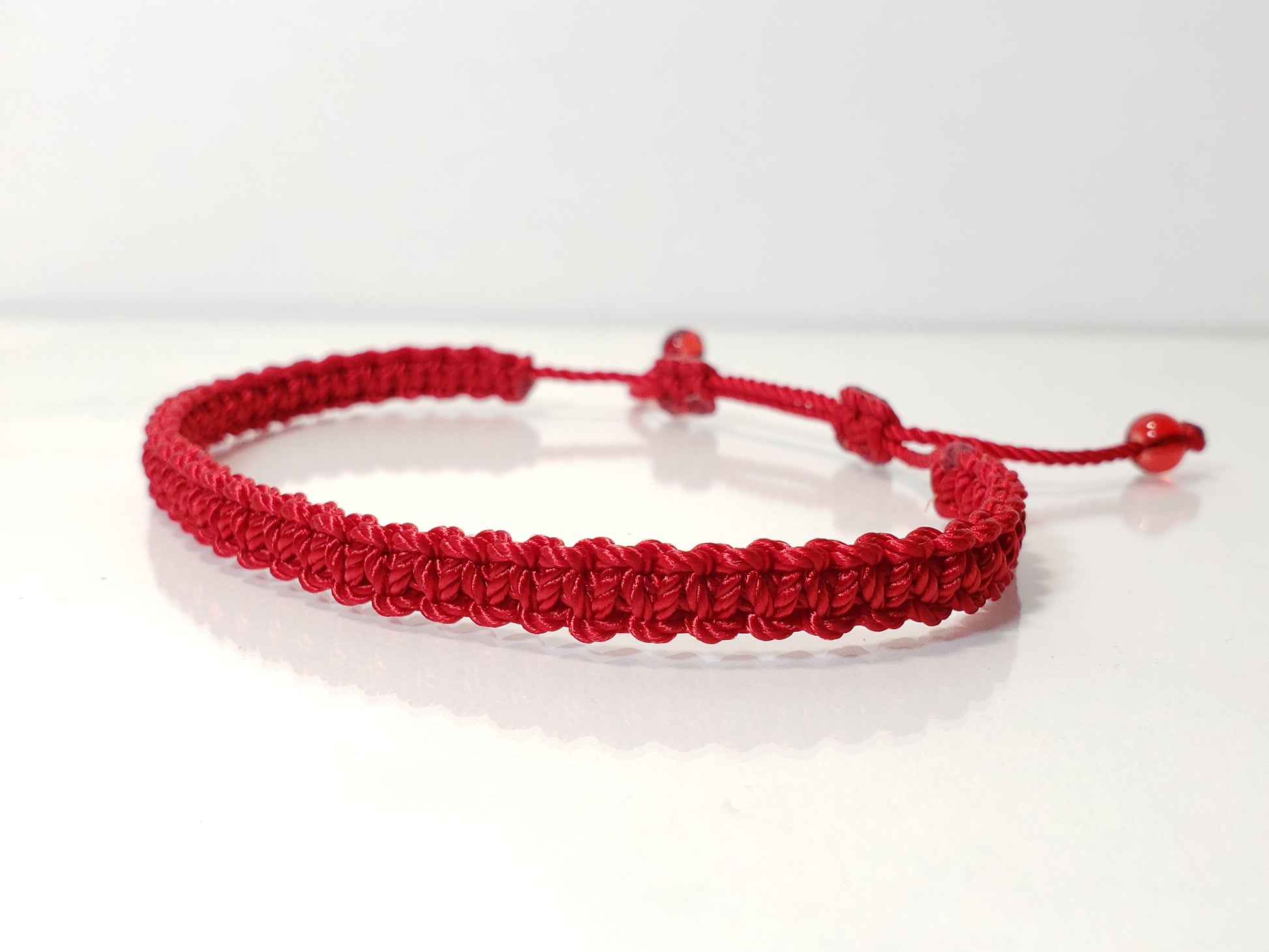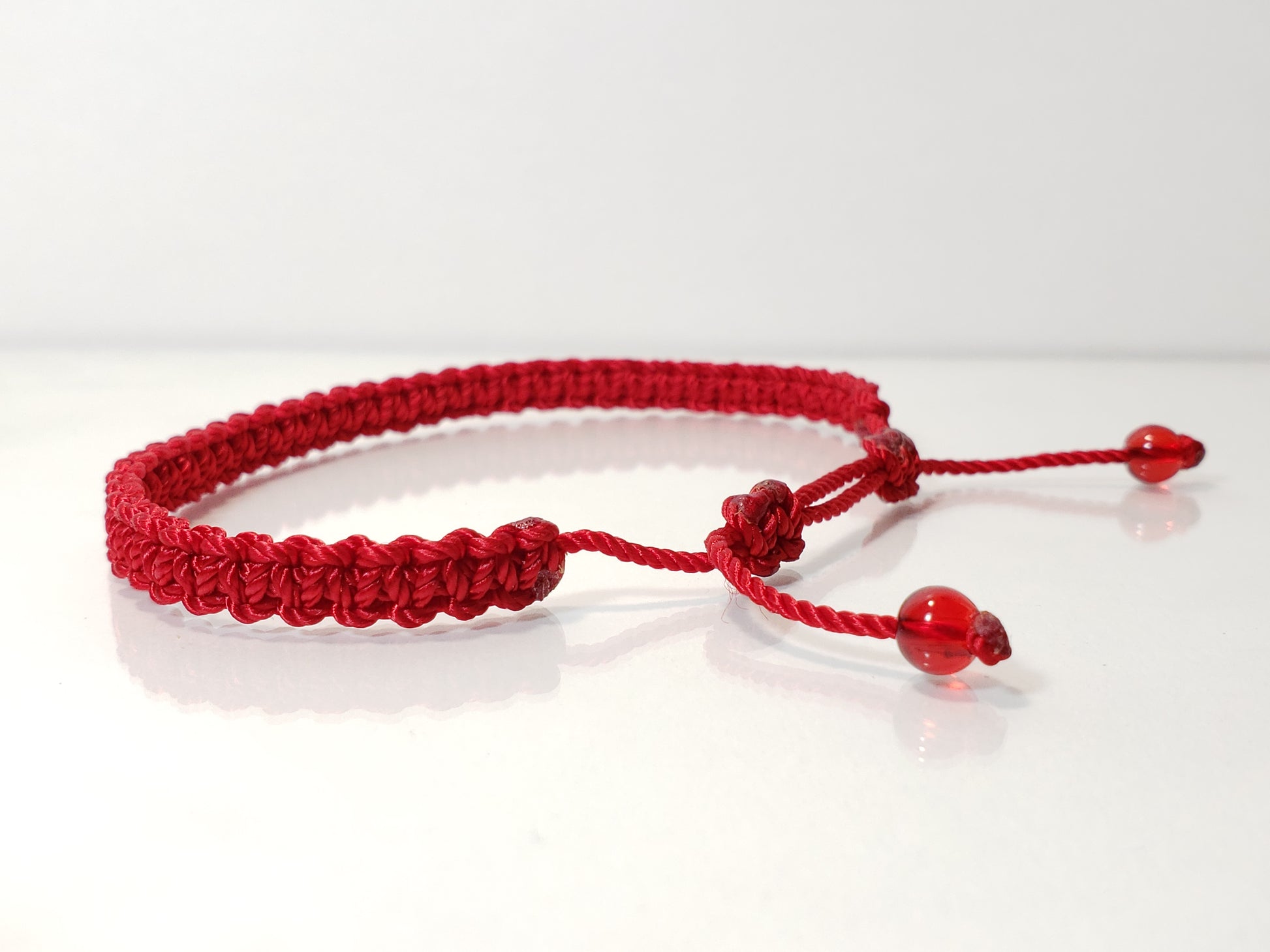 red string good luck braided anklet, adjustable from 7 to 12 1/2 inches.